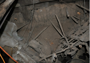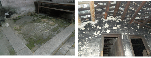 修繕前的四角樓的青磚地面(左)和屋頂(右)