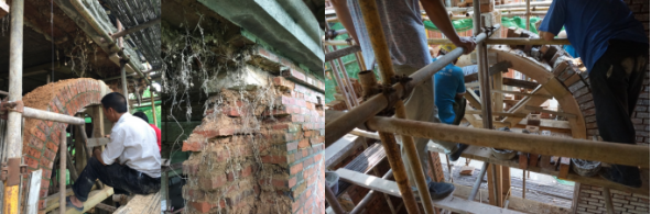 東南角修復(fù)中的拆砌工程中師傅們對變形的東南角進(jìn)行拆砌修復(fù)