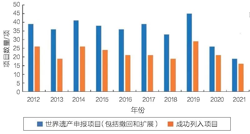 圖2 2012—2021年世界遺產(chǎn)大會(huì)申報(bào)(包含撤回和擴(kuò)展)和列入項(xiàng)目數(shù)量(來(lái)源:作者自繪)