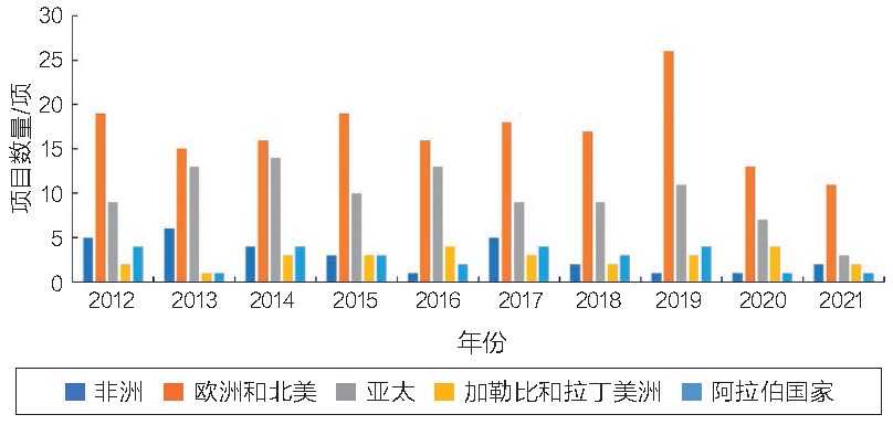 圖3 2012—2021年世界遺產(chǎn)大會(huì)申報(bào)項(xiàng)目數(shù)量的地區(qū)分布(來(lái)源:作者自繪)