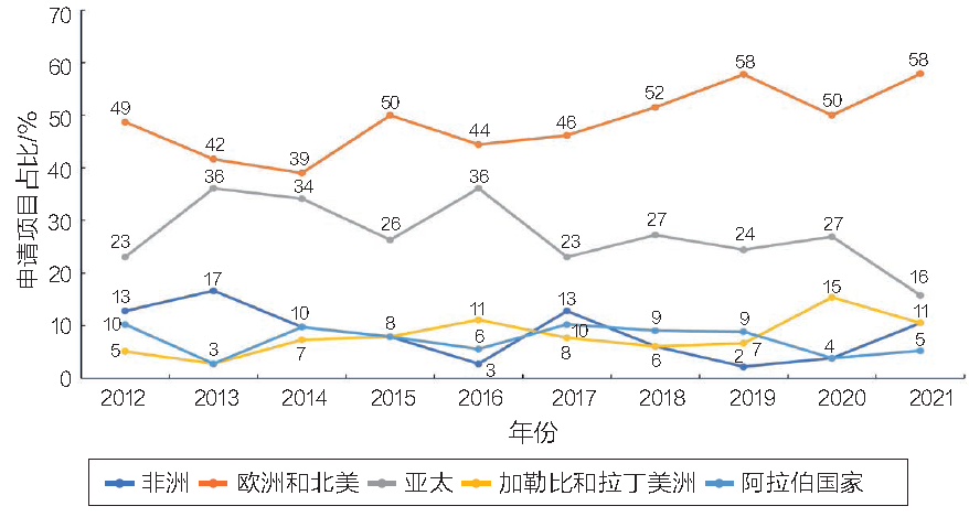 圖4 2012—2021年歷年申報(bào)項(xiàng)目所占比例的地區(qū)分布(來(lái)源:作者自繪)