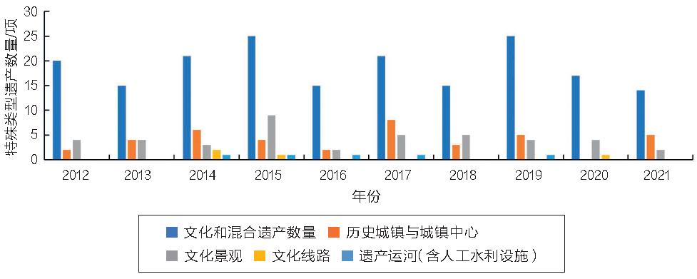 圖5 2012—2021年歷年成功列入項(xiàng)目中特殊類型遺產(chǎn)數(shù)量(來(lái)源:作者自繪)