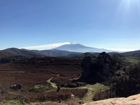巨石景觀及遠(yuǎn)處的艾特納活火山>>
