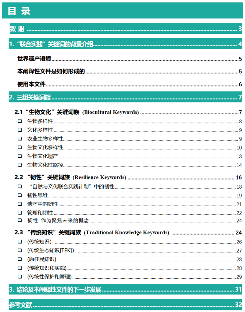 生物文化性關鍵詞族下相關專業(yè)術語的闡釋內容積極探索自然和文化的共同演進過程,以及自然、文化、語言和精神多樣性的相互關聯(lián)。這一詞族的關注重心從生物文化多樣性(特征)轉向生物文化性路徑,從(對遺產生物文化的)靜態(tài)或描述性的狀態(tài)轉向動態(tài)管理過程的認識。