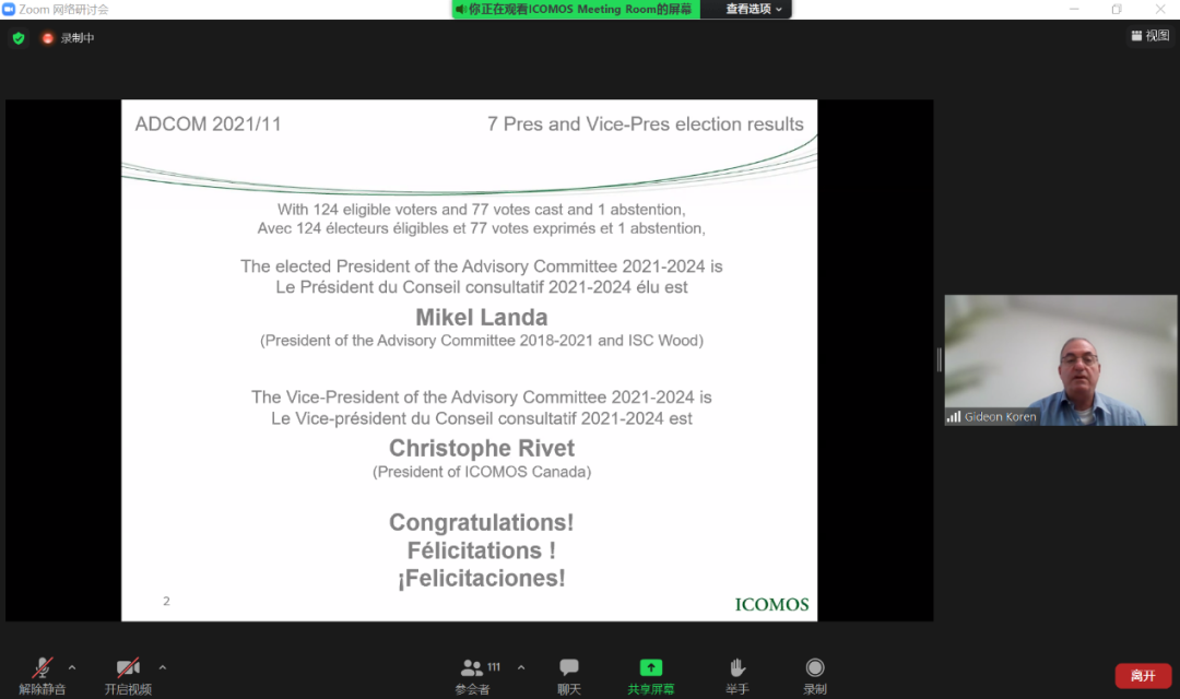 本屆年度會(huì)議通過在線選舉的形式,選舉產(chǎn)生了新一屆ICOMOS顧問委員會(huì)、國家委員會(huì)和科學(xué)委員會(huì)成員。西班牙代表米切爾·蘭達(dá)(Mikel Landa)當(dāng)選顧委會(huì)主席,加拿大代表克里斯托弗·里韋特(Christophe Rivet)當(dāng)選顧委會(huì)副主席。愛爾蘭代表迪爾德麗·麥克德莫特(Deirdre McDermott)、尼日利亞代表伊珊洛森·奧迪亞瓦(Ishanlosen Odiaua)、加拿大代表克里斯托弗·里韋特(Christophe Rivet)當(dāng)選國家委員會(huì)負(fù)責(zé)人;西班牙代表米切爾·蘭達(dá)(Mikel Landa)、印度代表尼廷·蘭維爾·辛哈(Nitin Ranveer Sinha)、澳大利亞代表謝里丹·伯克(Sheridan Burke)當(dāng)選科學(xué)委員會(huì)負(fù)責(zé)人。