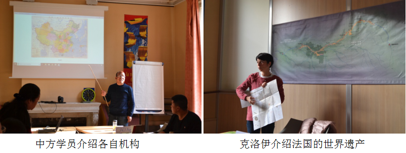 第一天的課程主要圍繞相互了解這一主題進行,首先由中方學(xué)員進行自我介紹,為了讓沒有來過中國的法方同事更好地了解中國的遺產(chǎn)地,學(xué)員們在中國地圖中指出自己所來自的省、市、遺產(chǎn)地位置。同樣地,在下午的法方介紹中,主講人克洛伊拿著由法國世界遺產(chǎn)協(xié)會繪制的法國世界遺產(chǎn)地圖一一為學(xué)員們介紹了法國的每一處世界文化遺產(chǎn)。在介紹遺產(chǎn)類型時,法方將“文化景觀與廣義遺產(chǎn)”歸為一種類型,我們培訓(xùn)的所在地“盧瓦爾河畔敘利與沙洛納間的盧瓦爾河谷”(以下簡稱“盧瓦爾河谷”)也在該類型之中。而針對這種類型劃分,中法遺產(chǎn)地管理者之間還進行了深度探討。隨后,學(xué)員們也了解到法國世界遺產(chǎn)協(xié)會成立于2007年,會員包括所有法國世界遺產(chǎn)地的管理者(截至2018年,共有44名成員),他們希望提高遺產(chǎn)地的保護和管理水平,對法國實施的公共政策展開思考,與國際社會的文化和自然遺產(chǎn)地開展合作,同時致力于遺產(chǎn)地的推廣。